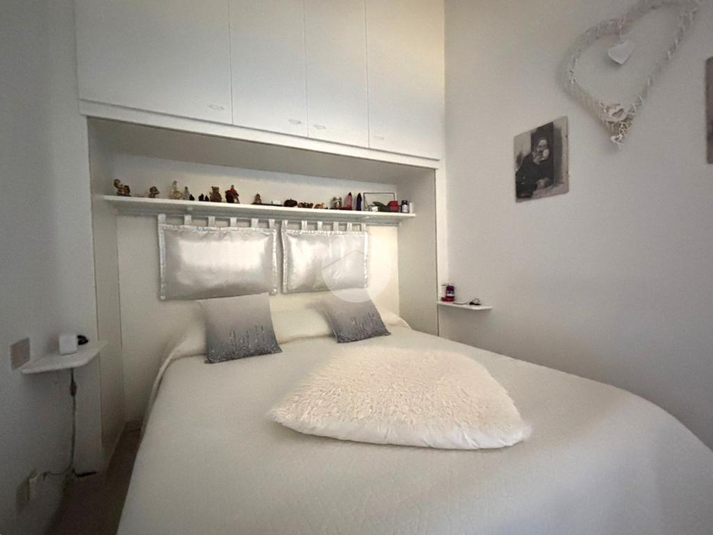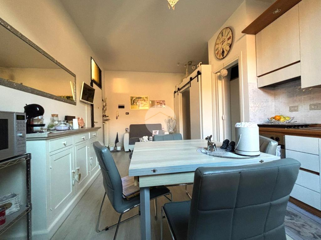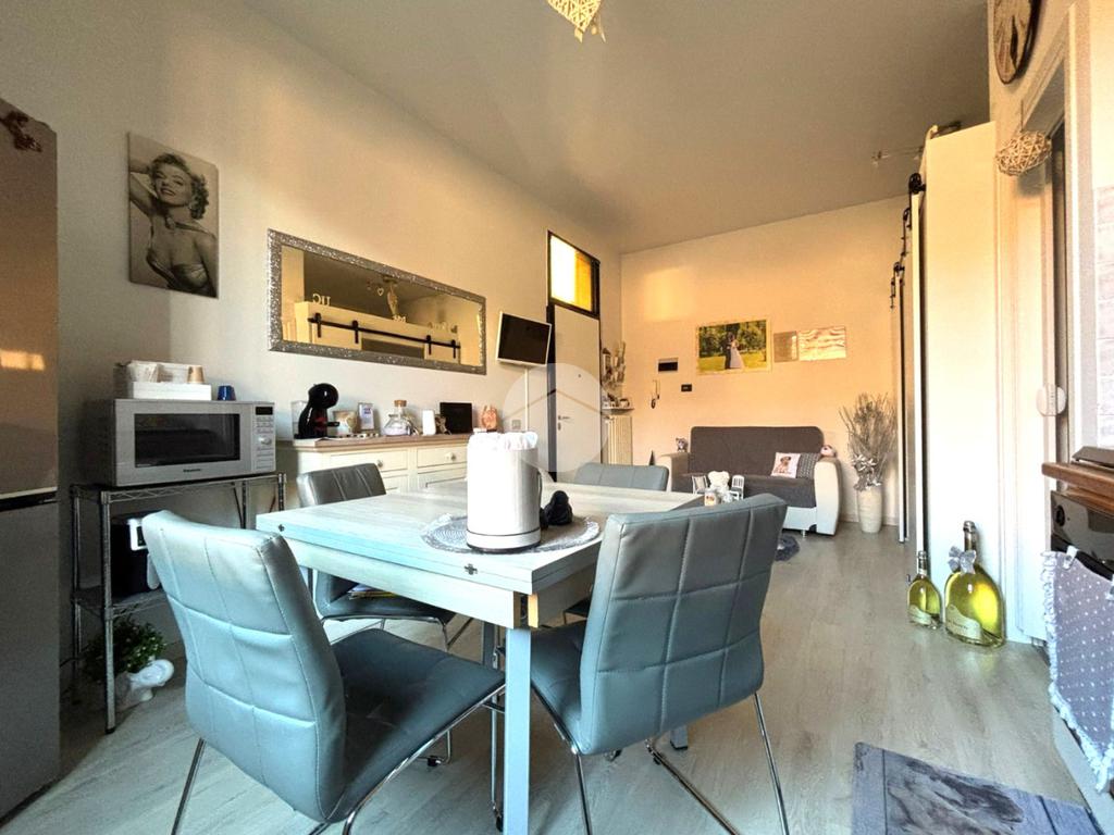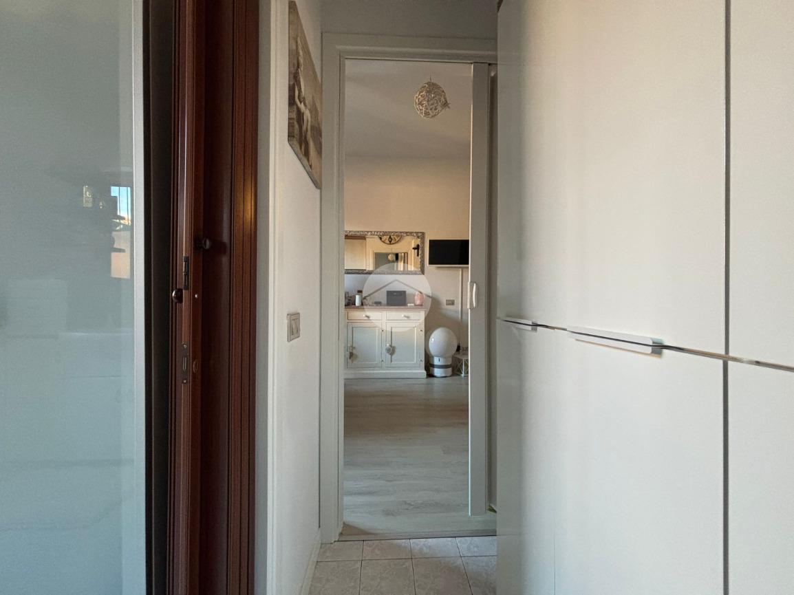 Troviamo quindi la zona giorno, con parete cottura, spazio per un tavolo da pranzo ed un divano e la 'cameretta' con letto matrimoniale con armadio a ponte. Ampio disimpegno con armadiatura su misura e bagno con doccia.