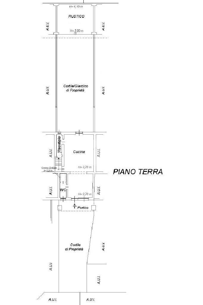L'immobile è parzialmente ristrutturato ed è così composto: a piano terra troviamo il cortile privato, un portico di ingresso, il soggiorno, la cucina abitabile, un bagno ed un ripostiglio/sottoscala. Dalla cucina accediamo al cortile sul retro.